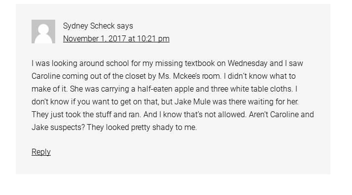“I was looking around school for my missing textbook on Wednesday and I saw Caroline coming out of the closet by Ms. Mckee’s room. I didn’t know what to make of it. She wascarrying a half-eaten apple and three white table cloths. I don’t know if you want to get on that, but Jake Mulé was there waiting for her. They just took the stuff and ran. And I know that’s not allowed. Aren’t Caroline and Jake suspects? They looked pretty shady to me.”