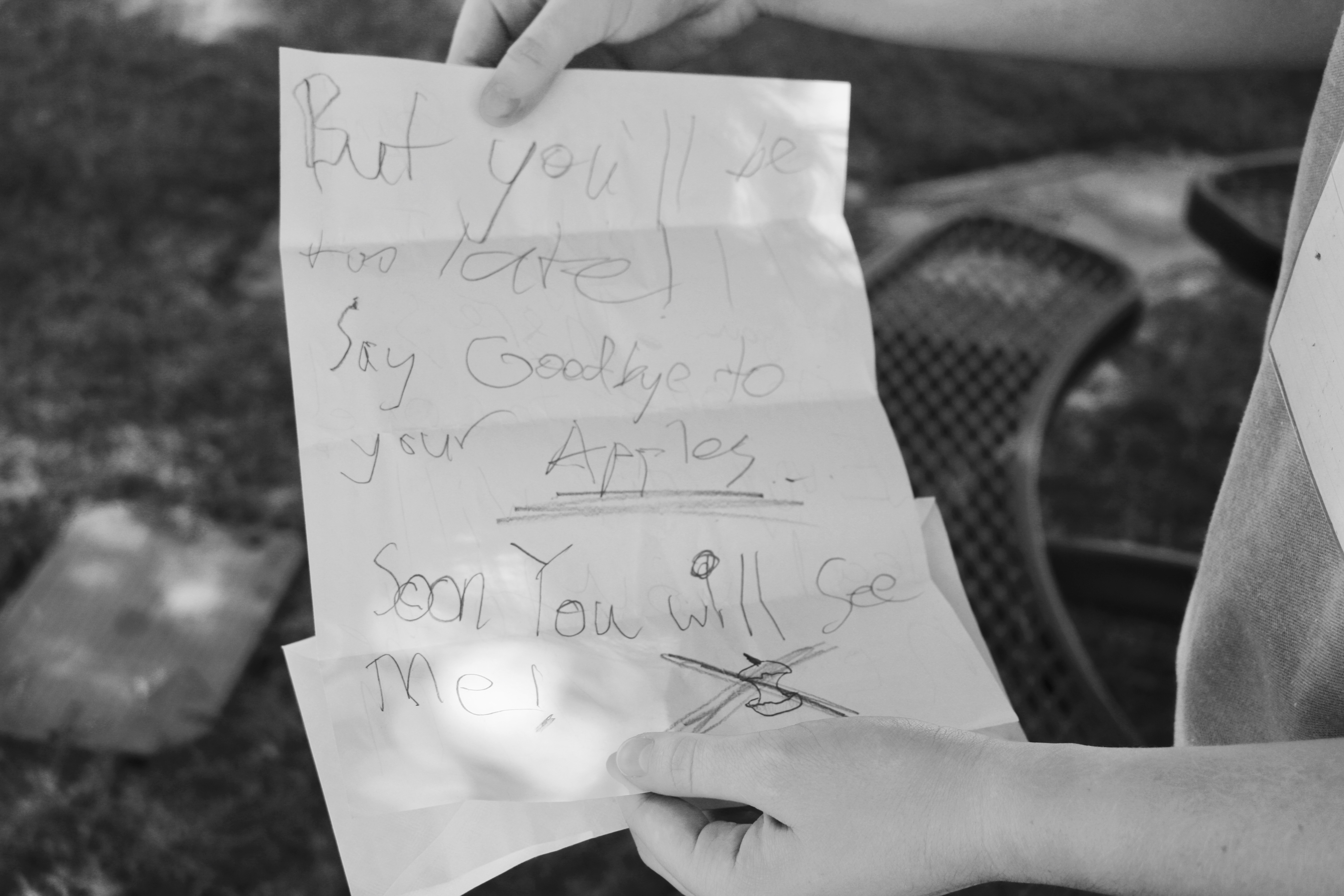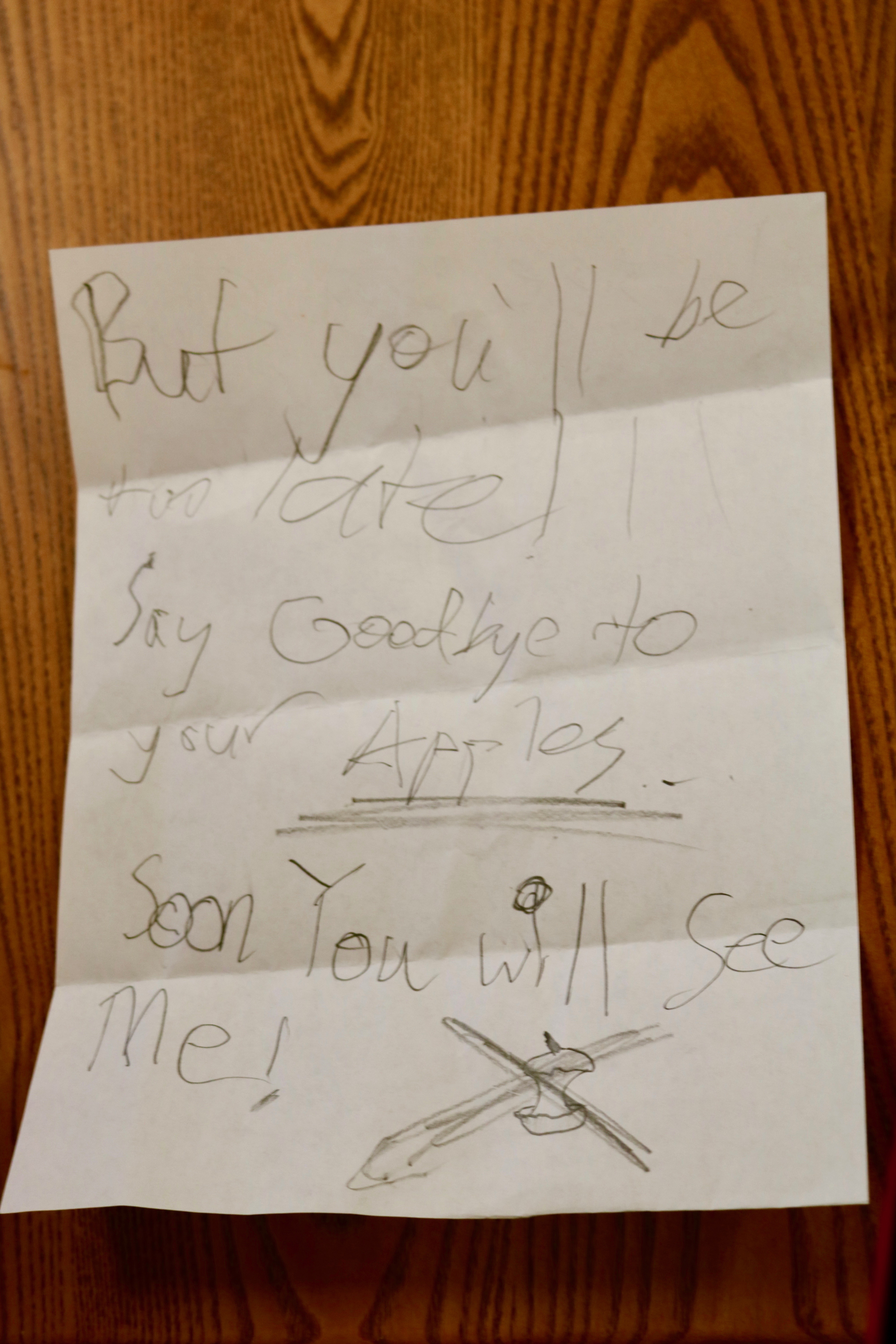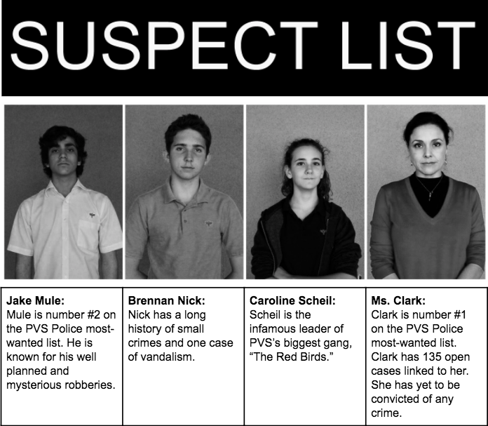 “I was looking around school for my missing textbook on Wednesday and I saw Caroline coming out of the closet by Ms. Mckee’s room. I didn’t know what to make of it. She wascarrying a half-eaten apple and three white table cloths. I don’t know if you want to get on that, but Jake Mulé was there waiting for her. They just took the stuff and ran. And I know that’s not allowed. Aren’t Caroline and Jake suspects? They looked pretty shady to me.”